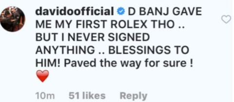 Replying a fan who asked him if the statement from D'banj is true, Davido slammed the claims. He confirmed D'banj indeed gave him a Rolex watch but he never signed unto his label.