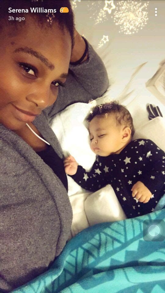 Tennis champion,Serena Williams shared adorable moments with her sleeping daughter on Snapchat.Another below